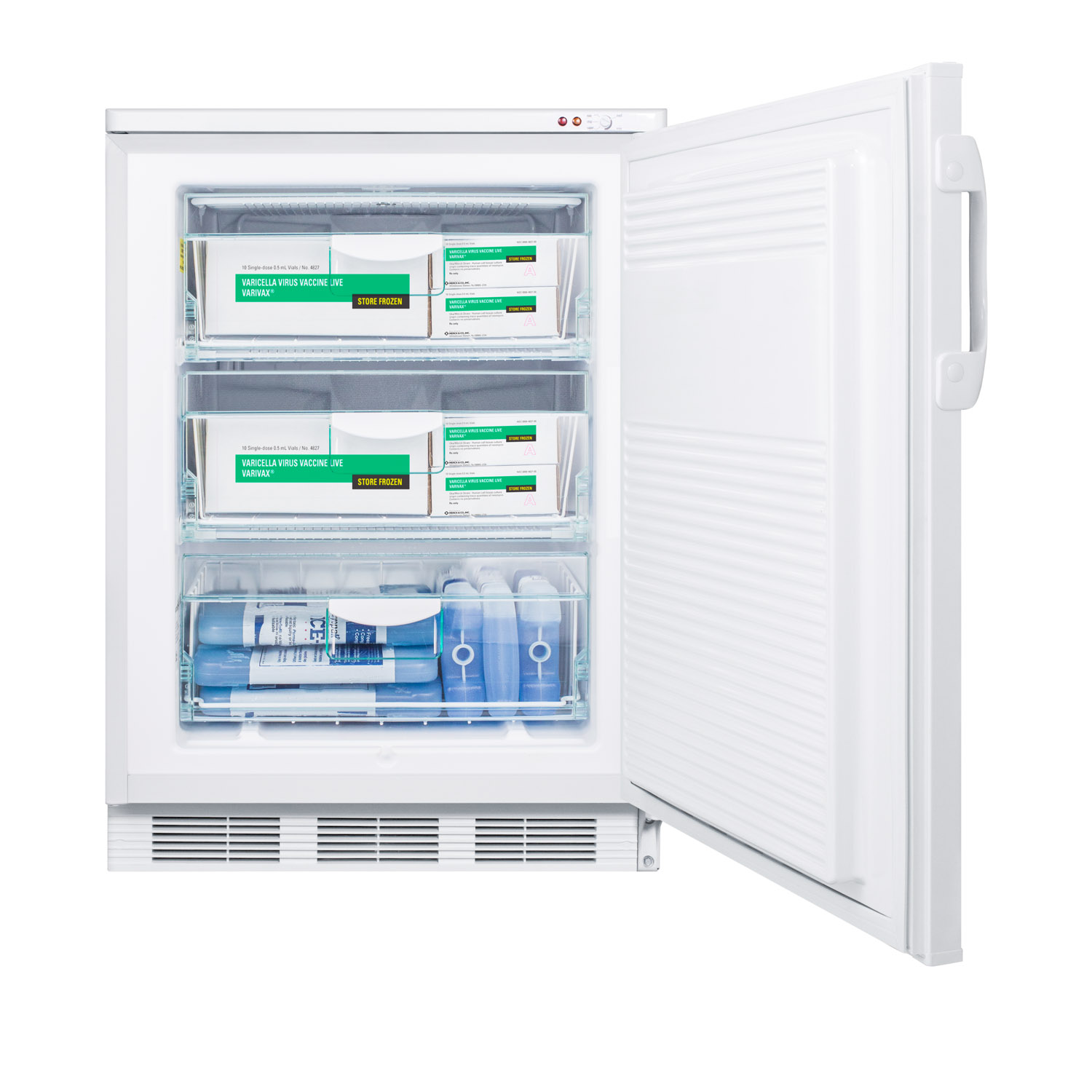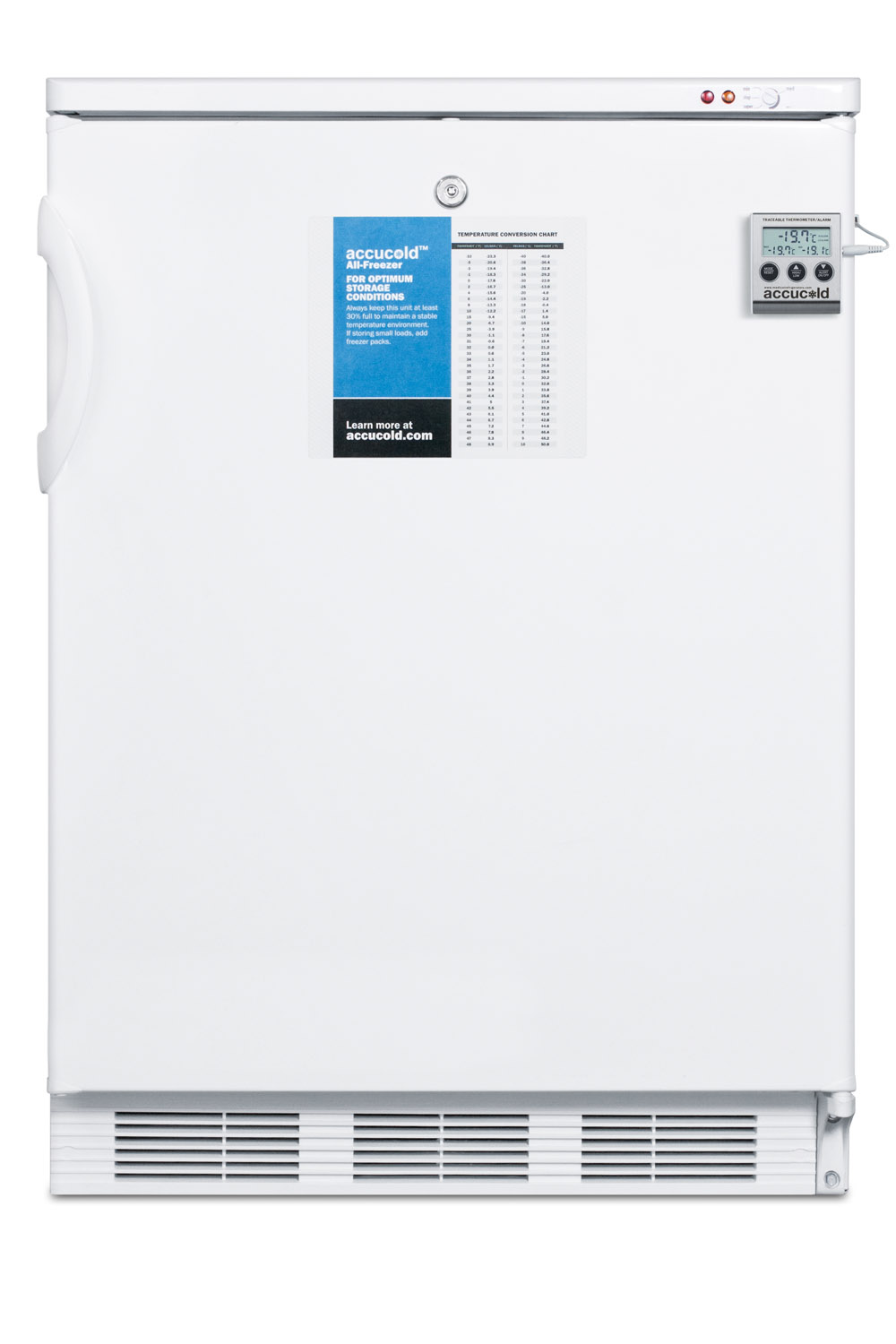 Accucold by Summit Appliance's MED series all-freezers come fully featured for stabilized temperature performance for use in medical, scientific, pharmaceutical, and laboratory institutions.The VT65MLBIMED has a 24" footprint and can be used built-in or freestanding. It comes in a white finish and includes a front-mounted lock for added security.The manual defrost VT65MLBIMED operates several degrees colder than most freezers for safe long-term storage of food, vaccines, or pharmaceuticals. Temperatures can reach and maintain -25º C. Three removable pull-out basket drawers provide convenient storage solutions, while extra thick insulation limits energy waste and keeps the cold inside. We include an audible NIST calibrated temperature alarm complete with an external display of the current and high/low temperature mounted on the door. A green dot hospital grade plug is installed for added safety in high traffic areas. An access port allows users to connect their own monitoring equipment. With its slim size and reliable construction, the VT65MLBIMED works well in any setting in need trusted storage. Additionally, we offer a variety of options to customize this unit, including USB data loggers, digital thermostats, self-closing doors, and more.